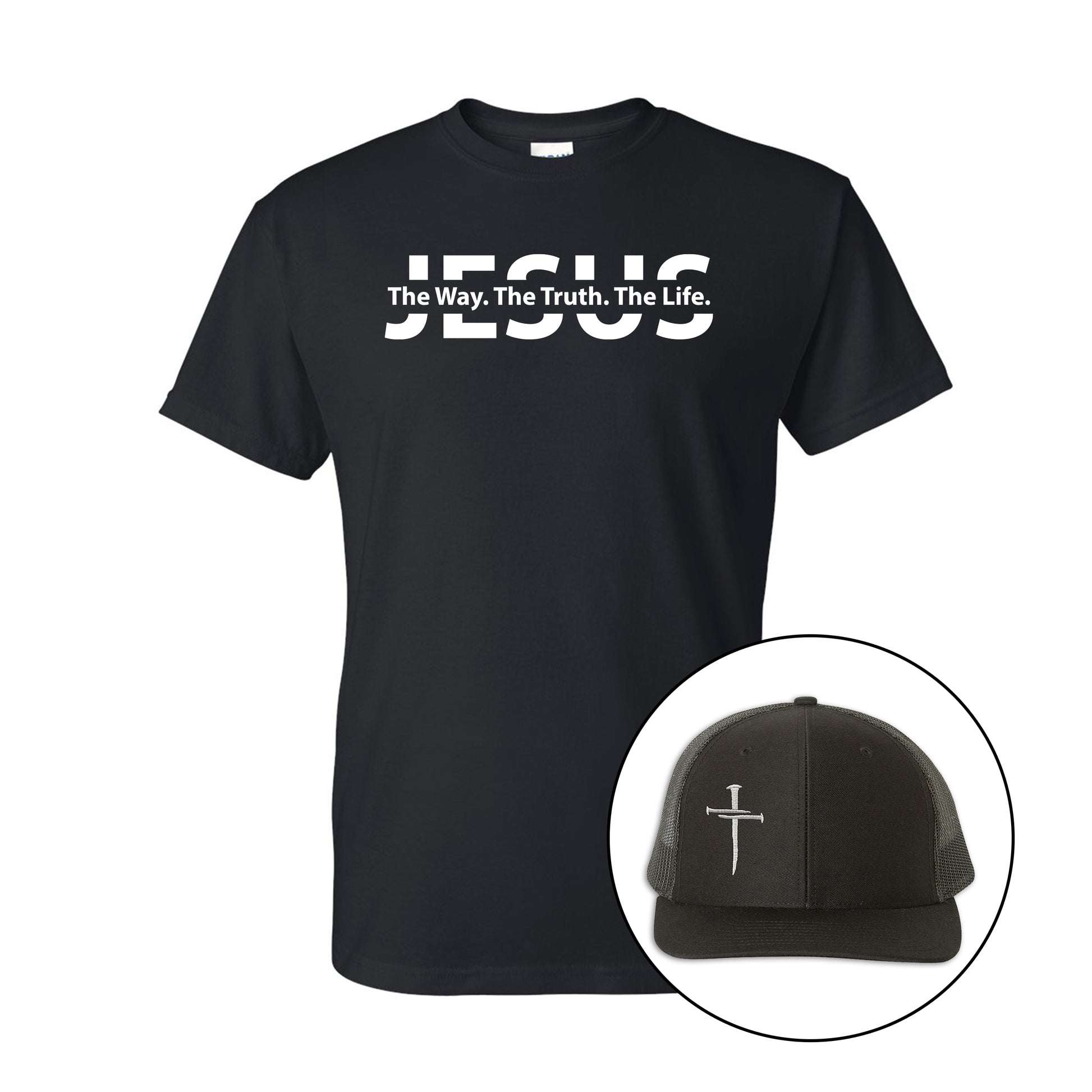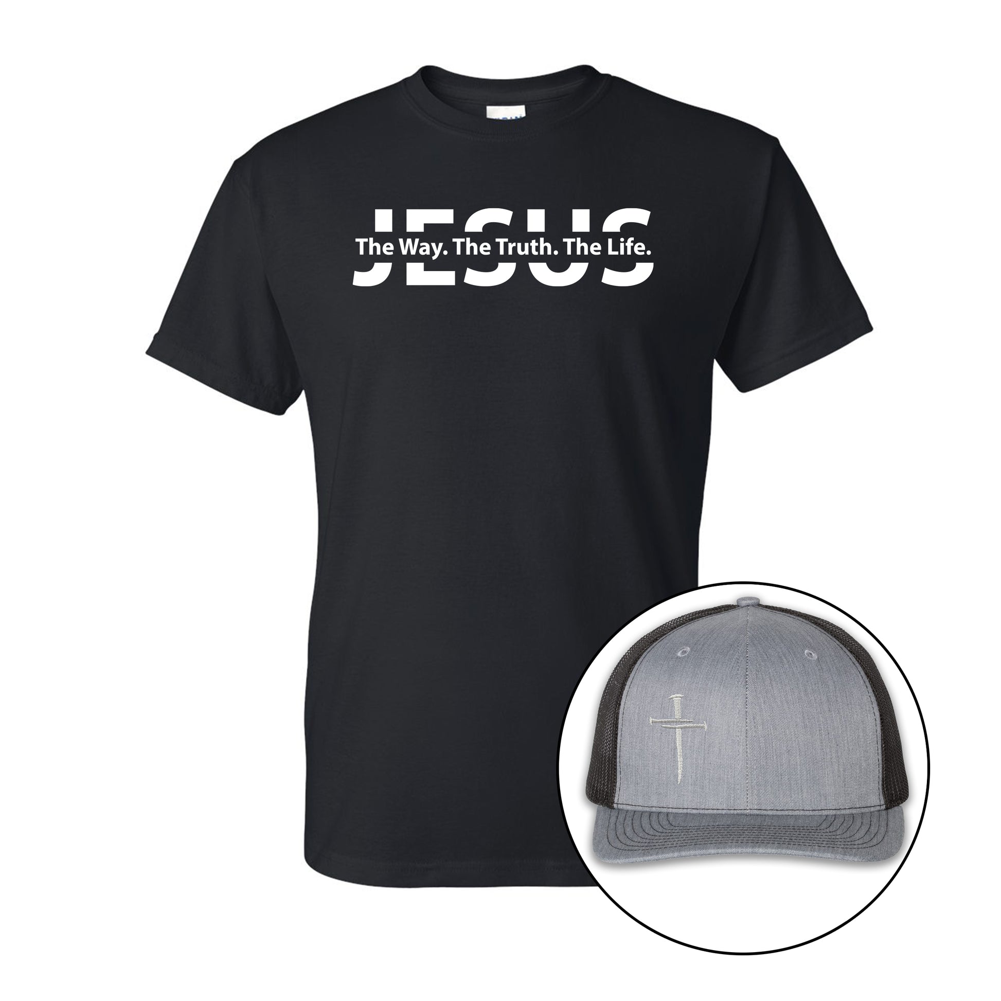 T-Shirt: The set includes a Gildan DryBlend T-shirt, made from a comfortable 50/50 cotton-polyester blend that wicks moisture to keep you cool and dry. The shirt features "Jesus, The Way. The Truth. The Life." screen printed on the front, a powerful declaration of faith that you can wear anywhere.